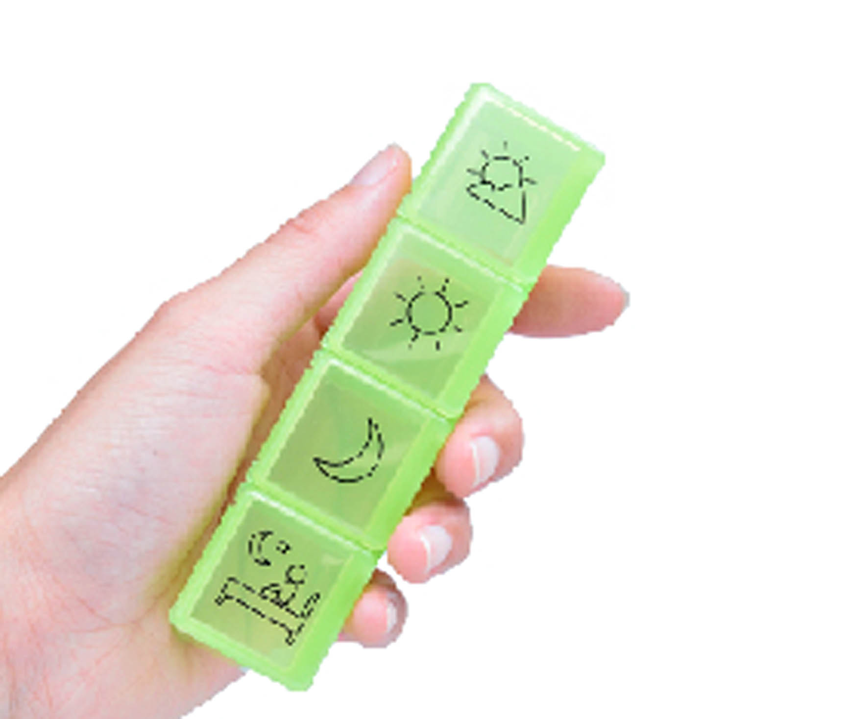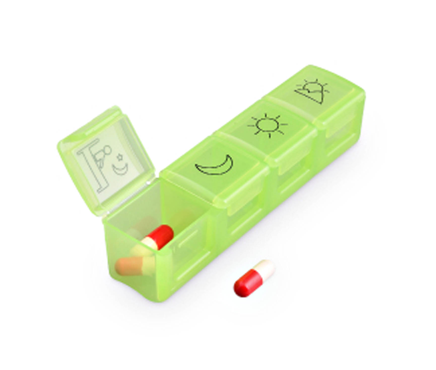 ■ 四格設計:適合存放早、中、晚、睡前的慢性病藥物或維生素C等保健藥品(每格可容納約12顆一般膠囊)